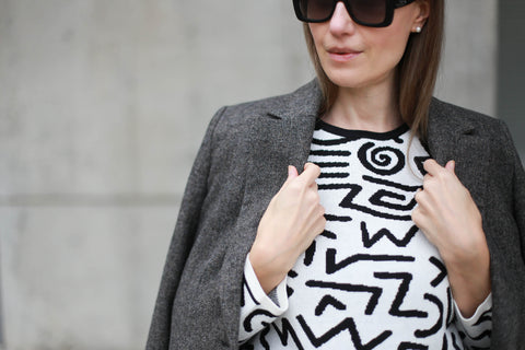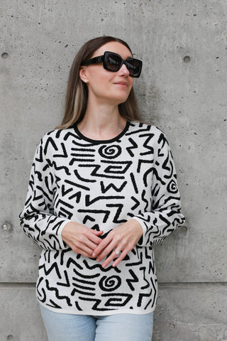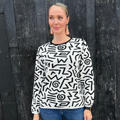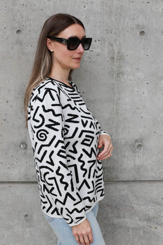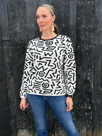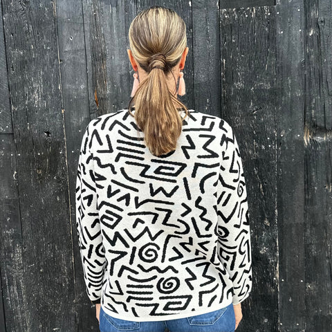A classic crew neck pullover with long sleeves and ribbed trims. Its off-white ground is covered in black markings, like abstract etchings or scribbled letters across a page. Subtle yet striking, it gives a timeless silhouette an artful edge. High hip length is 25" from shoulder.