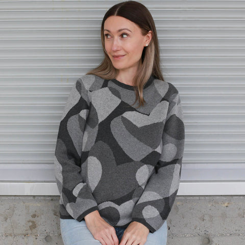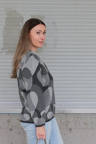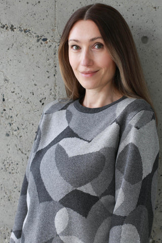 A cascade of overlapping hearts sets the tone for this pullover, where shifting shades of grey heather create an abstract, shadowed effect. Finished with a jewel neckline, long sleeves, and rib trims, this soft cotton sweater balances artistic detail with an easy, timeless shape.