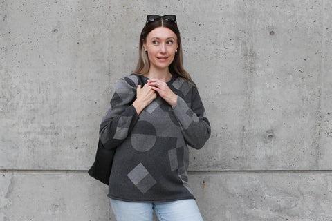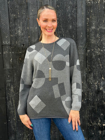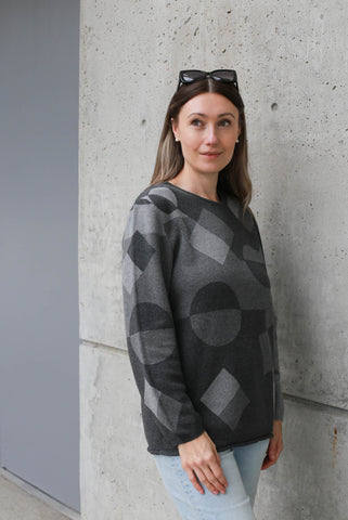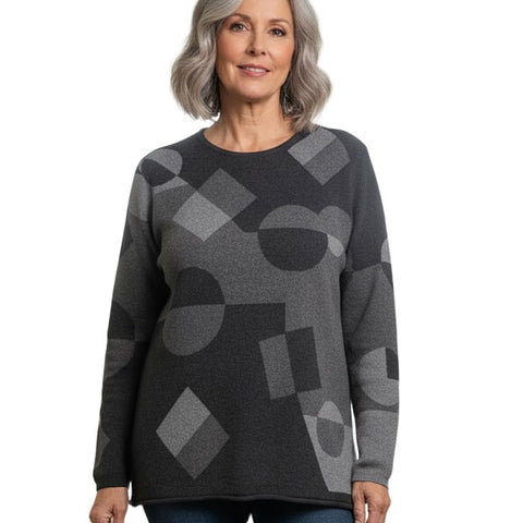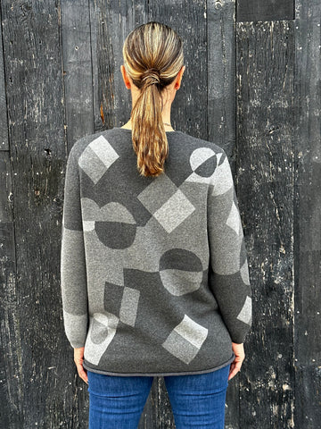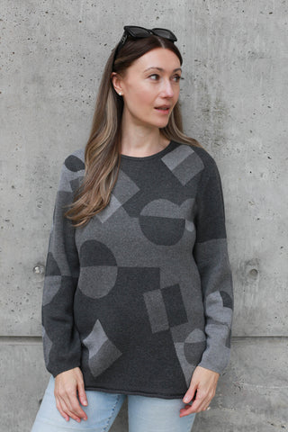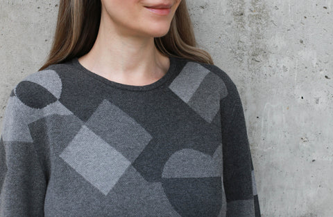 A study in shape and shadow, this pullover is knit in 100% cotton with a jewel neckline, long sleeves, and rib trims. The tunic length (27 inches) makes it an easy fit, while the pattern plays in contrasting shades of gray heather—blocks, spheres, and bold color blocking creating a graphic rhythm across the sweater.