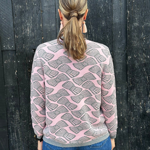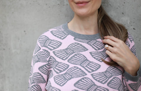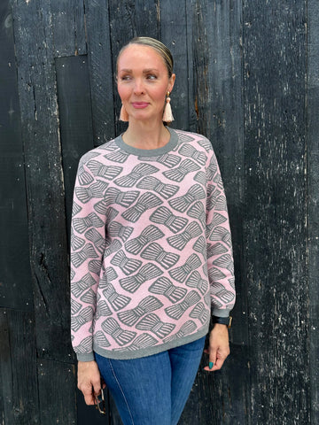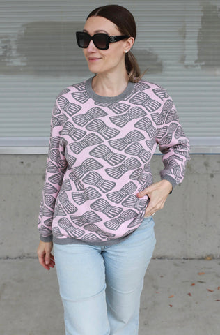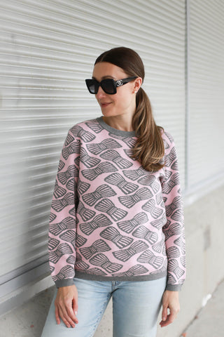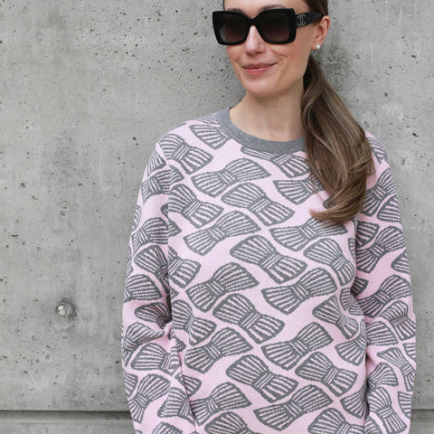 A soft take on playful charm, this pullover sweater is knit in a fine gauge jacquard with a delicate pink ground and striped bows in grey heather tossed all over the front, back and sleeves. The jewel neckline and long sleeves are finished with classic rib trims, while a scalloped rib hem adds a romantic touch. Clean-lined yet sweet, it's a piece that balances whimsy with effortless wearability.